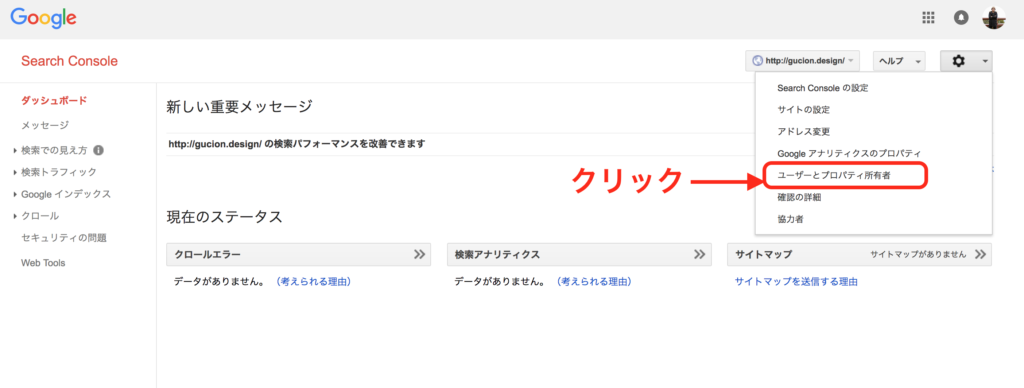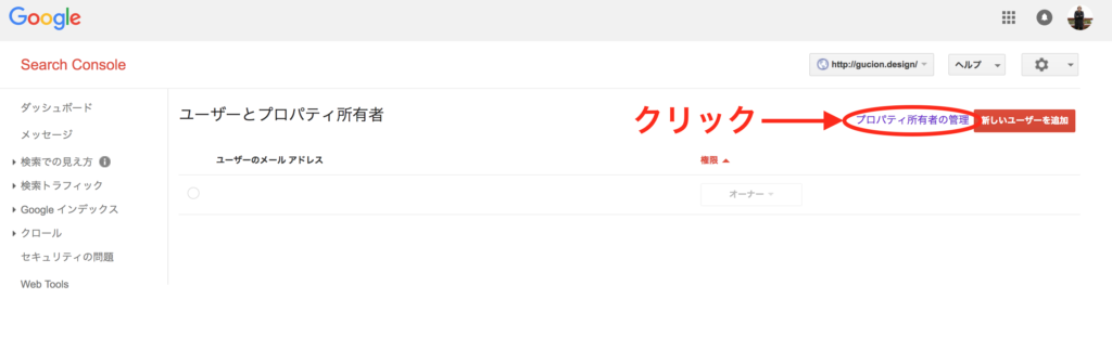 Googleサーチコンソールのホーム画面右上の設定ボタンより「ユーザーとプロパティ所有権」をクリックします。