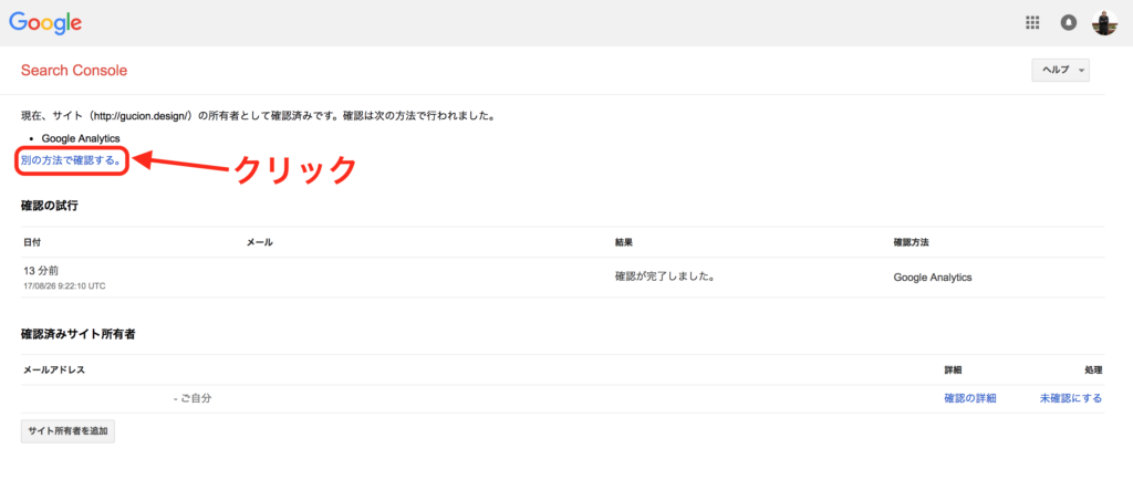 サーチコンソール所有権の管理画面内にて「別の方法で確認する。」リンクをクリックします。