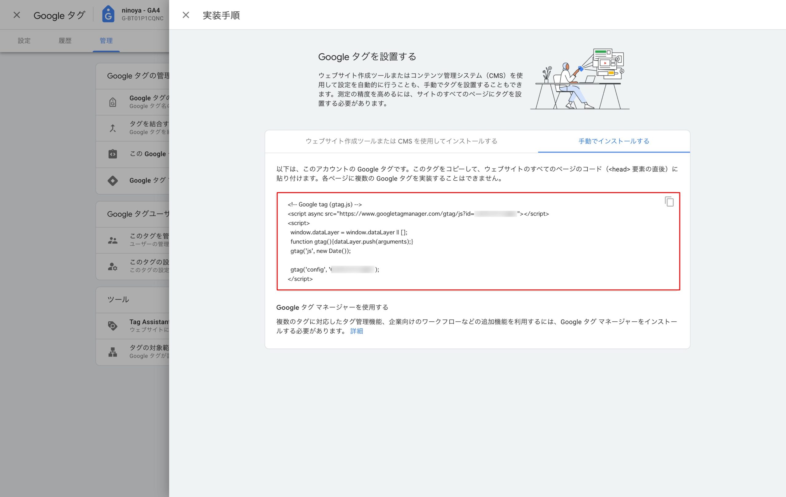 GAを開き、管理>プロパティ>データ ストリーム >ウェブと進みます。公式ヘルプの手順に沿って、添付赤枠のタグを取得します。