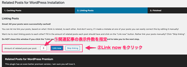 続いて、関連記事の表示件数を上記①の通り指定します。今回は、3記事分の関連記事を表示するよう設定。表示件数を入力後、「Link now」をクリックしましょう。