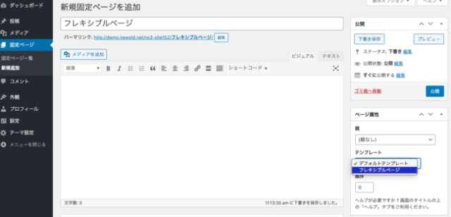 WordPress管理画面に戻り、[固定ページ]→[新規追加]をクリック。
