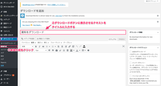 プラグインを無事に有効化できましたら、WordPress管理画面から[Downloads]→[ALL Downloads]→[Add New]をクリック。