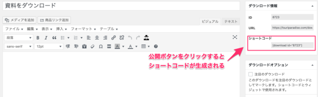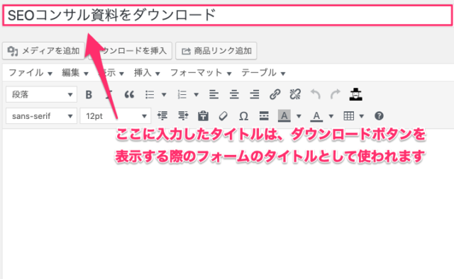 タイトルを記入できたら、さきほど作成したダウンロードボタンのショートコードを貼り付けましょう。