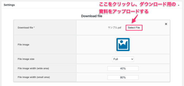 ページ下部へスクロールすると、[Settings]→[Download file]という項目があるので、[Select File]をクリックして、ダウンロード資料をアップロードします。