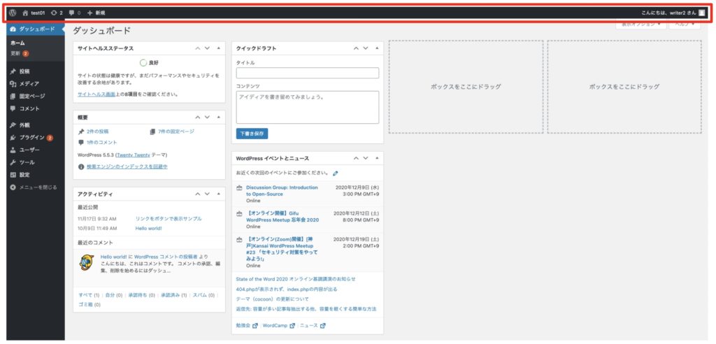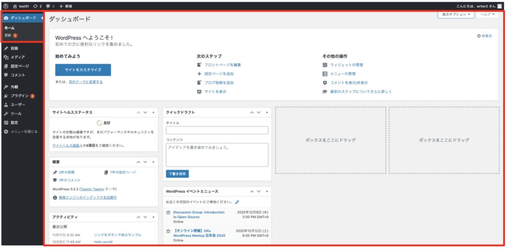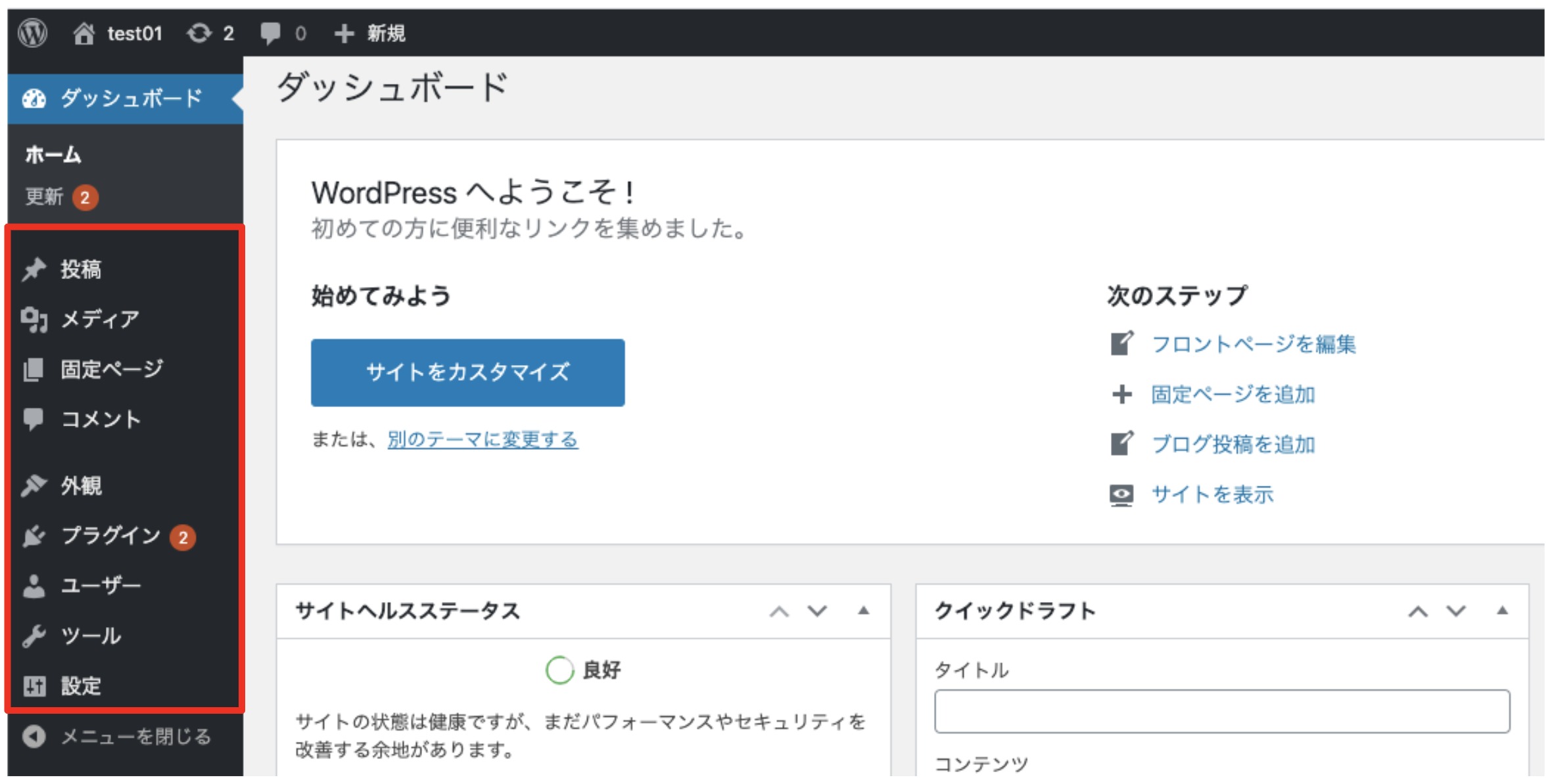 ダッシュボードは、WordPressの管理画面の一部です。次の画像でいうと赤枠部分がダッシュボードであり、Webサイトに関する様々な情報やお知らせが表示されています。