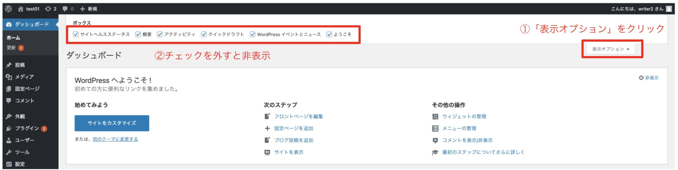 「WordPressへようこそ!」を再表示したい場合は、上述した「表示オプション」で、「ようこそ」という部分にチェックを入れると再表示されるようになります。