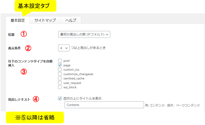 | ③以下のコンテンツタイプを自動挿入 | 目次が自動で挿入されるコンテンツタイプを設定する。投稿に自動で挿入させるなら「post」、固定ページなら「page」にチェックを入れる。 |