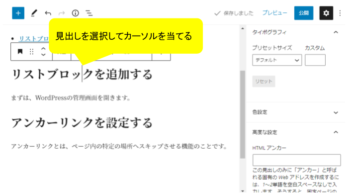 1. 移動先のh2やh3といった「見出し」をクリックする