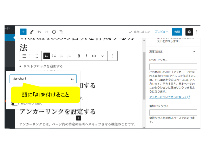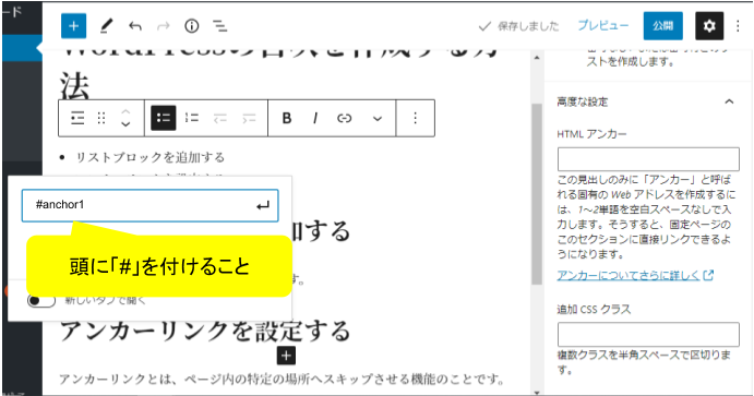 頭に「#」を付けずにHTMLアンカーを入力すると、アンカーリンクが上手く機能しません。上記イラストのように、移動先のHTMLアンカーが「anchor1」なら移動元は「#anchor1」と入力してください。