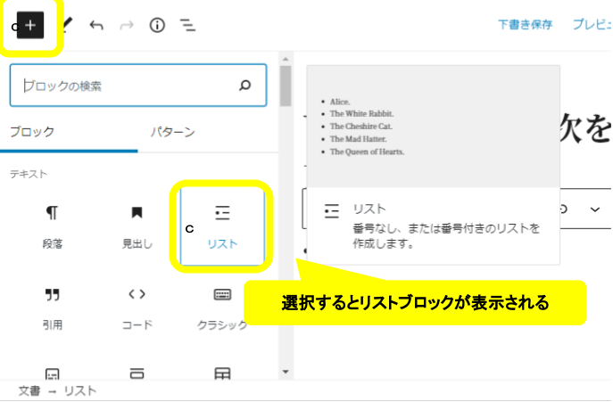 - 「+>ブロックパネル>リスト」でリストブロックを追加する
