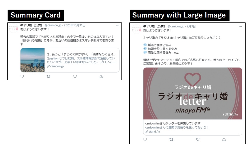 Twitterカードは、表示の方法で現在4つの種類にわけることが出来ます。そのうち一般的なブログや投稿記事で使用されるのは2種類、「Summary Card」と「Summary with Large Image」。残りの2種類はモバイルアプリ配布用と動画配信用になりますので、ここでの紹介は割愛します。