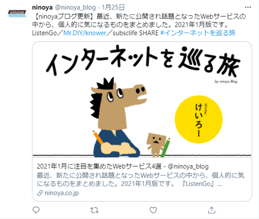 上記のツイートは、画像の大きな「Summary with Large Image」を使用しています。サムネイル画像がとても目を引きますよね。「Summary Card」の場合、画像はこれよりも小さくなりますが、記事タイトルや説明文のスペースが広くなります。