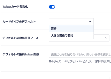 まず設定すべきは、「カードタイプのデフォルト」。「要約」と「大きな画像で要約」の2つから選べます。迷ったら、ここは先述の通り、目立つ「大きな画像」を選んだ方がタイムライン内でも目立ちますしベターです。
