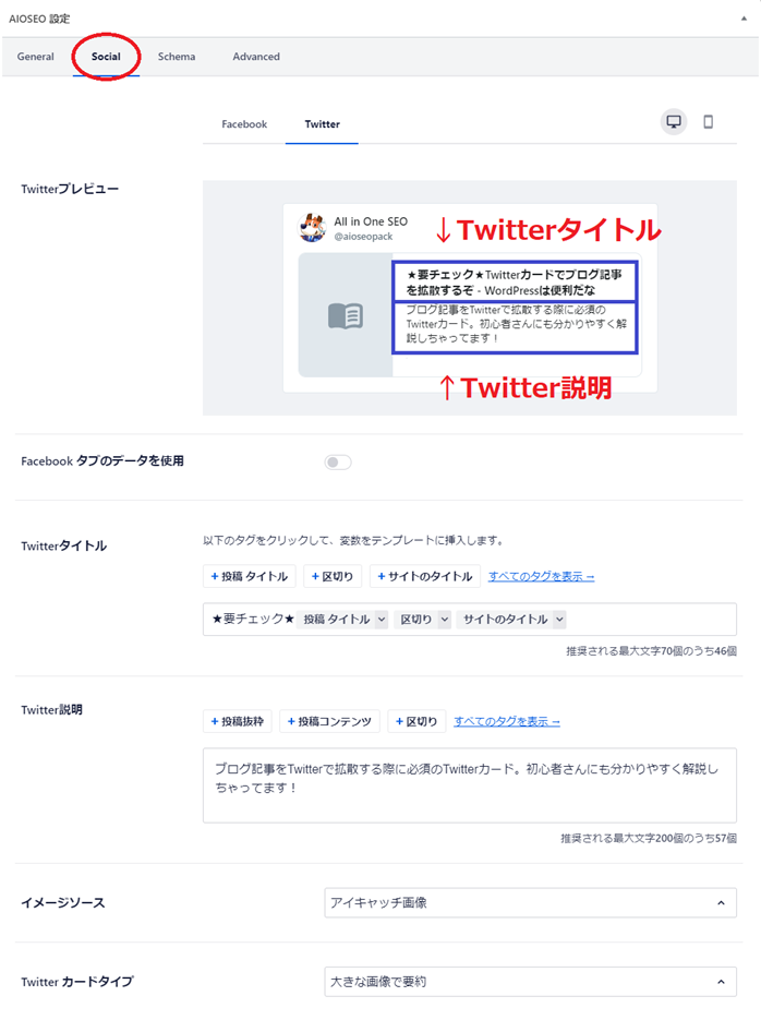 Twitterカードの記事別設定は、「Social」タブで行います。Facebook・TwitterのタブからTwitterを選択しましょう。