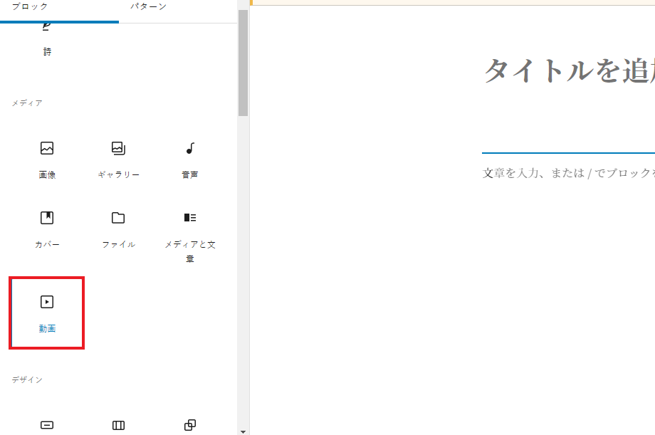 左側に出てきた画面をスクロールし「メディア」という項目の中にある「動画」をクリックします。