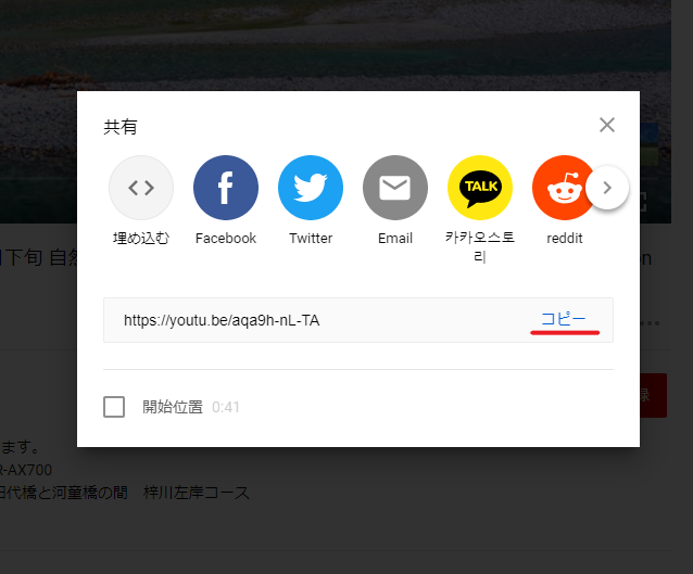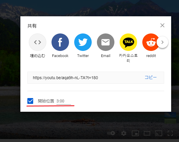 もう1つは「共有」をクリックして表示された画面下に出ている「開始位置」にチェックをつけてから「コピー」をクリックする方法。こちらは動画を指定の位置で停止させなくても、手動で時間を入力して開始位置を設定できます。