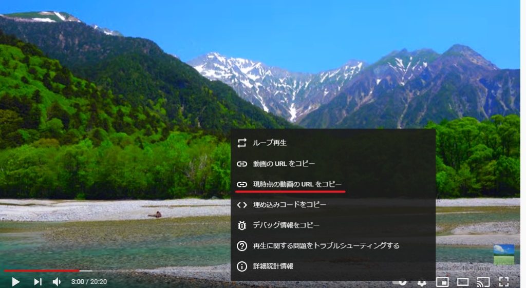 1つは動画を指定の位置(今回であれば3分の位置)で停止させて、動画を右クリックし「現時点の動画のURLをコピー」をクリックする方法です。