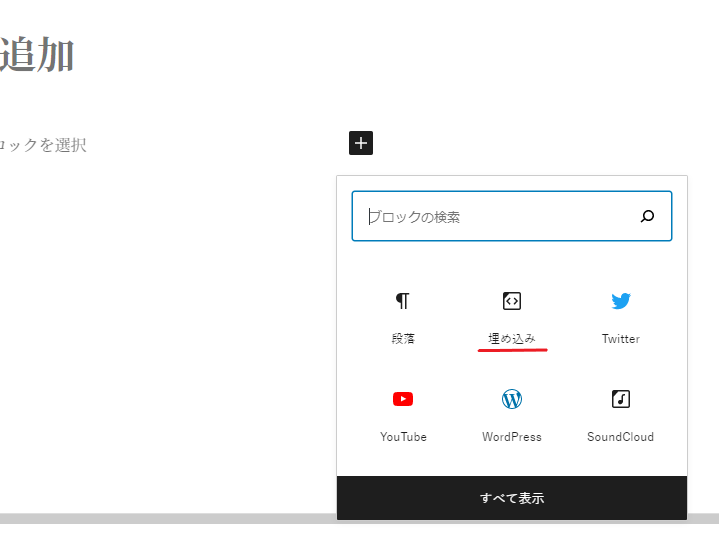 記事作成画面でブロックエディタを開き、記事内の動画の埋め込みをしたい場所をクリック。次に、右側に出ている黒枠の「+」ボタンをクリックして「すべて表示」をクリックします。