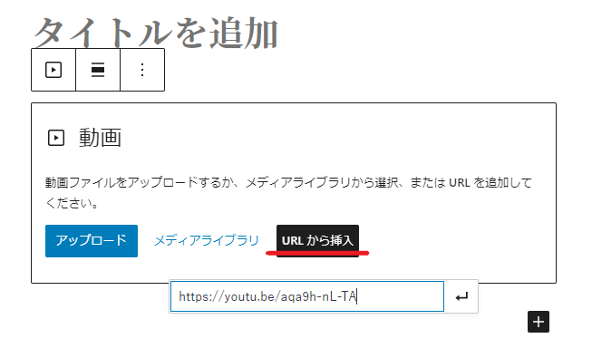 直接WordPressに動画をアップロードする時と同じように「+」ボタンをクリックして「動画」をクリック。「URLから挿入」をクリックしてURLを貼り付けるだけです。