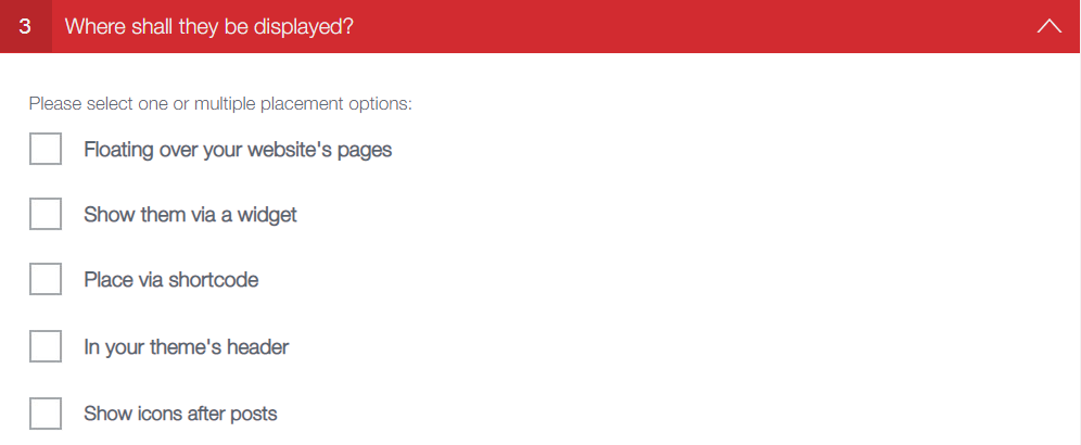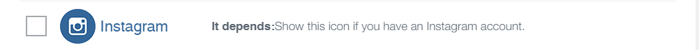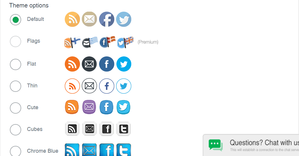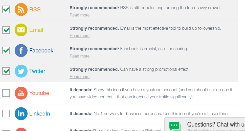 デフォルトで、RSS、Email、Facebook、Twitterの4つにはチェックが付いています。なお、「It depends:Show this icon if you have a Telegram account.」と記載されている項目は、SNSのアカウントがないとSNSシェアボタンが表示されません。