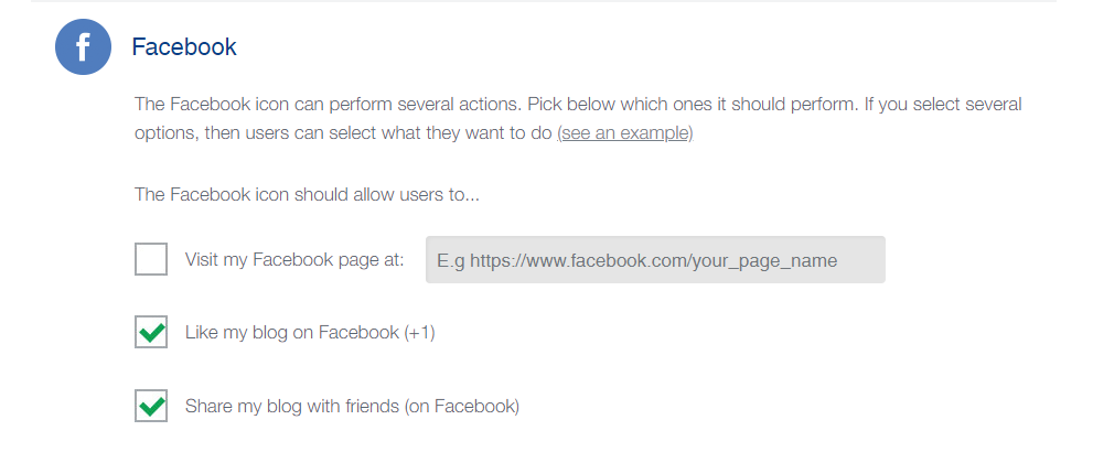 RSS、Email、Facebook、Twitterは、クリックしたときの動作を設定することができます。たとえばFacebookの場合は、クリックしたときに「フェイスブックページに移動」「いいね!が付く」、「友達とシェア」といった設定が可能です。