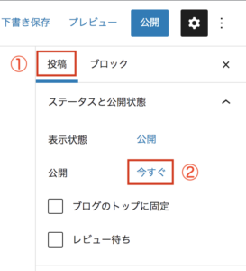 記事を書き終わったら同画面のメニューで①「投稿」を選択し、②「公開」の右側にある「今すぐ」をクリックします。