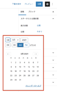 カレンダーの日付をクリックするか数値を直接入力し、公開日時を指定します。時刻表記は12時間制なので 「AM」か「PM」のどちらかを選択します。ここでは現在時刻の2日後に設定しました。