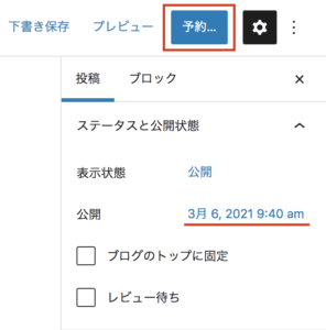 公開日時の指定が終わると上部の青いボタンが「公開」から「予約…」に変わるのでクリックします。