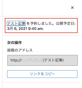 次のように予約投稿された旨が表示されると設定は完了です。指定した日時になっているか確認しましょう。