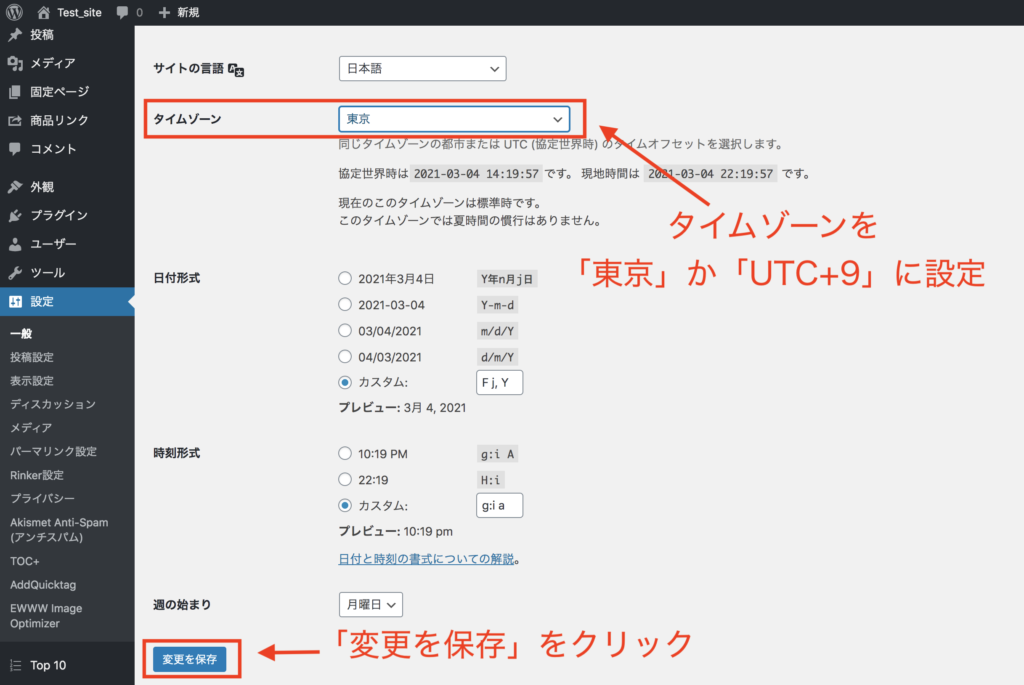 対処法は、まずWordpressの「設定」>「一般」から、タイムゾーンが正しいタイムゾーンになっているか確認します。日本時間にする場合は「東京」か「UTC+9」を選択して「変更を保存」をクリックします。