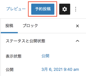 予約投稿が完了すると、下記のように青ボタンの表示が「予約投稿」に変わります。