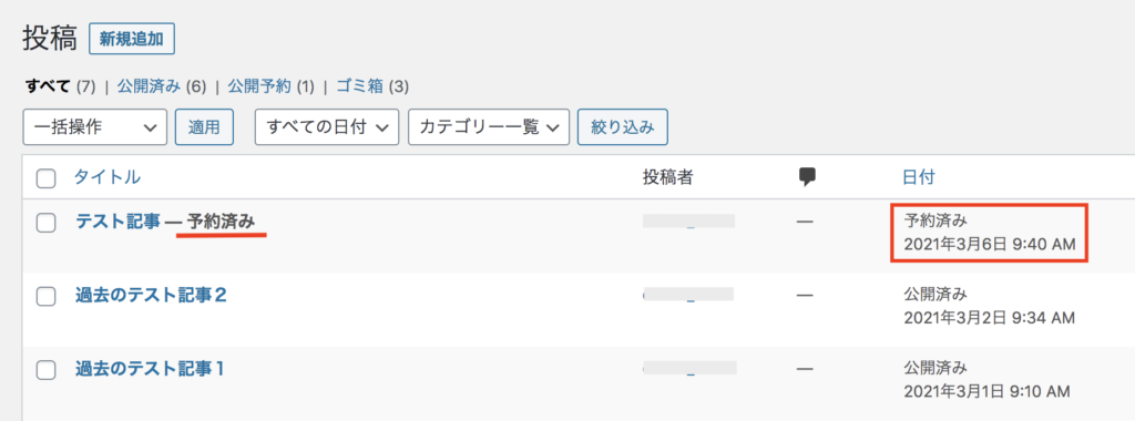 投稿が完了したかどうかはダッシュボードの「投稿」>「投稿一覧」でも確認できます。予約投稿した記事タイトルの右側に「-予約済み」と表示され、「日付」の列でも「予約済み」になっていれば予約手順は完了しています。