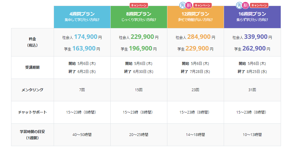 受講生一人に対してプロのエンジニア講師がついて、最後までプログラミング学習をやりきる「パーソナルメンター制度」が大きな特徴です。