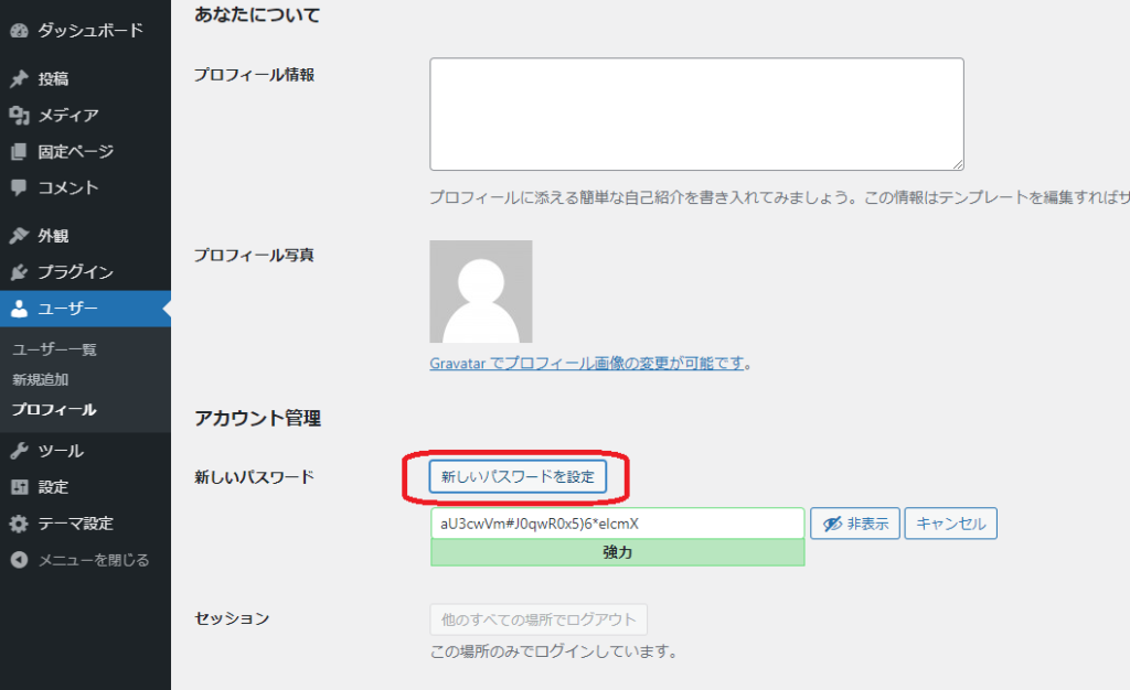 管理画面のユーザー一覧から自分のプロフィールを開き、上画像の赤丸部分『新しいパスワードを設定』ボタンを押して下さい。