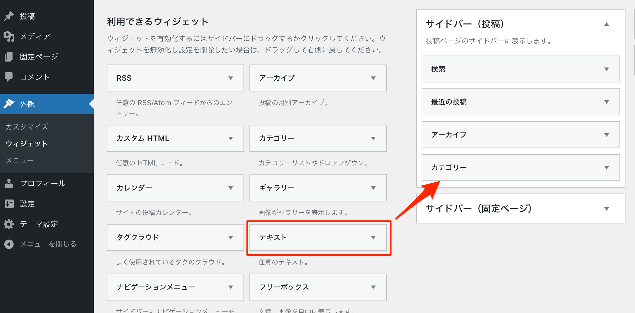 WordPress管理画面の「外観」>「ウィジェット」画面で、「テキスト」ウィジェットをサイドバーにドラッグします。