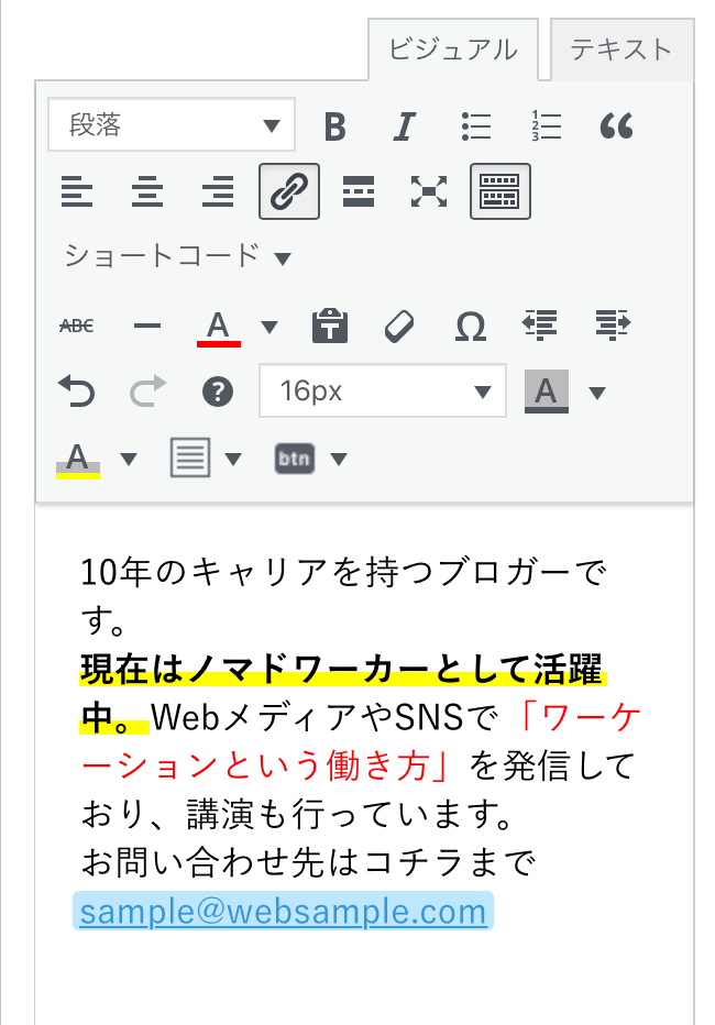 ビジュアルエディターが使えるので、文字の色を変えたりマーカーを引いたりして、文字装飾ができます。