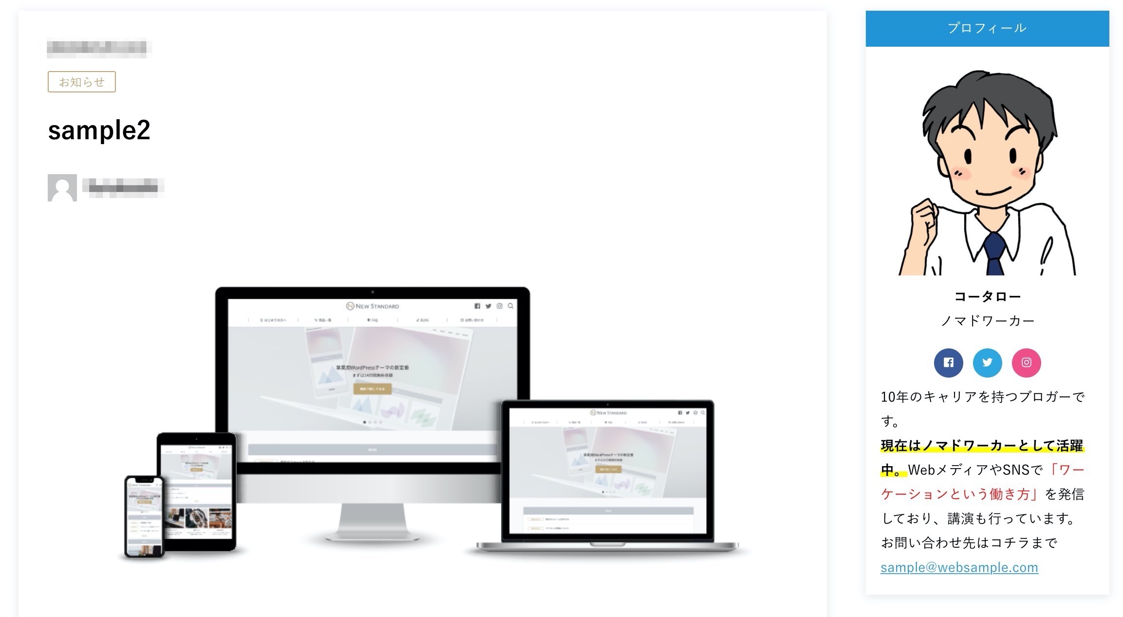 「NewStandard」のプロフィールは、サイドバーだけではなく、記事下に表示することもできます。
