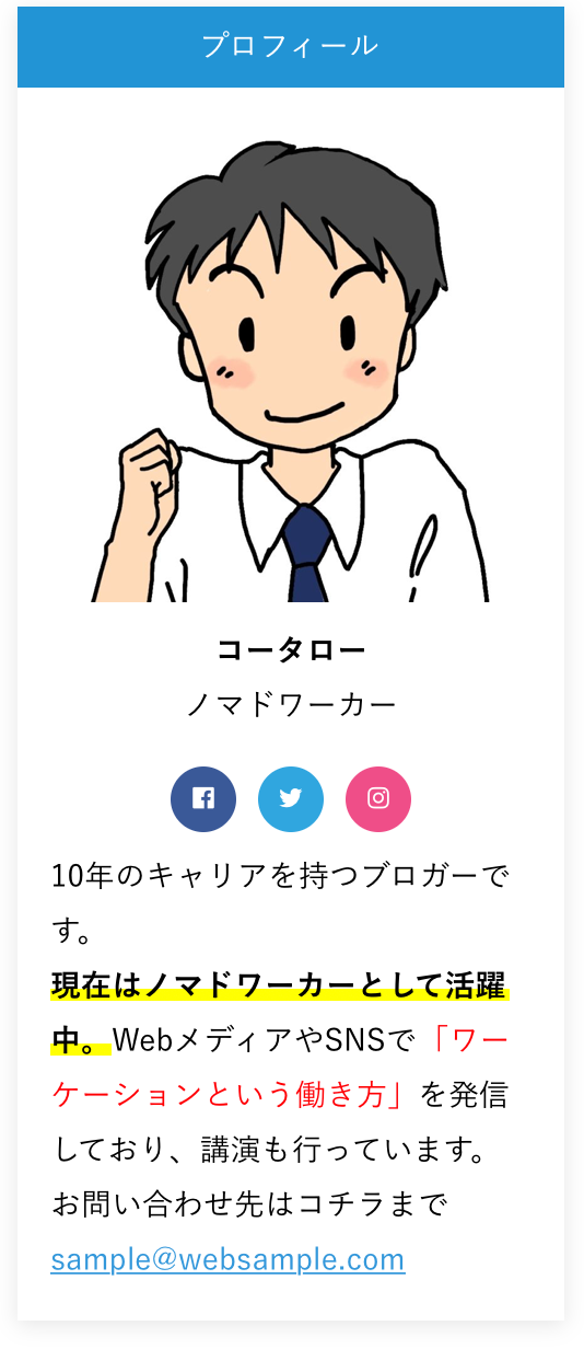 スマホで閲覧する場合、サイドバーは表示されないか、ページの下のほうに表示される場合があるので、記事下へプロフィールを表示すると効果的です。