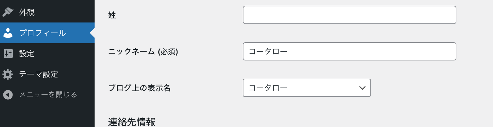 WordPress管理画面で「プロフィール」設定ページを表示させます。