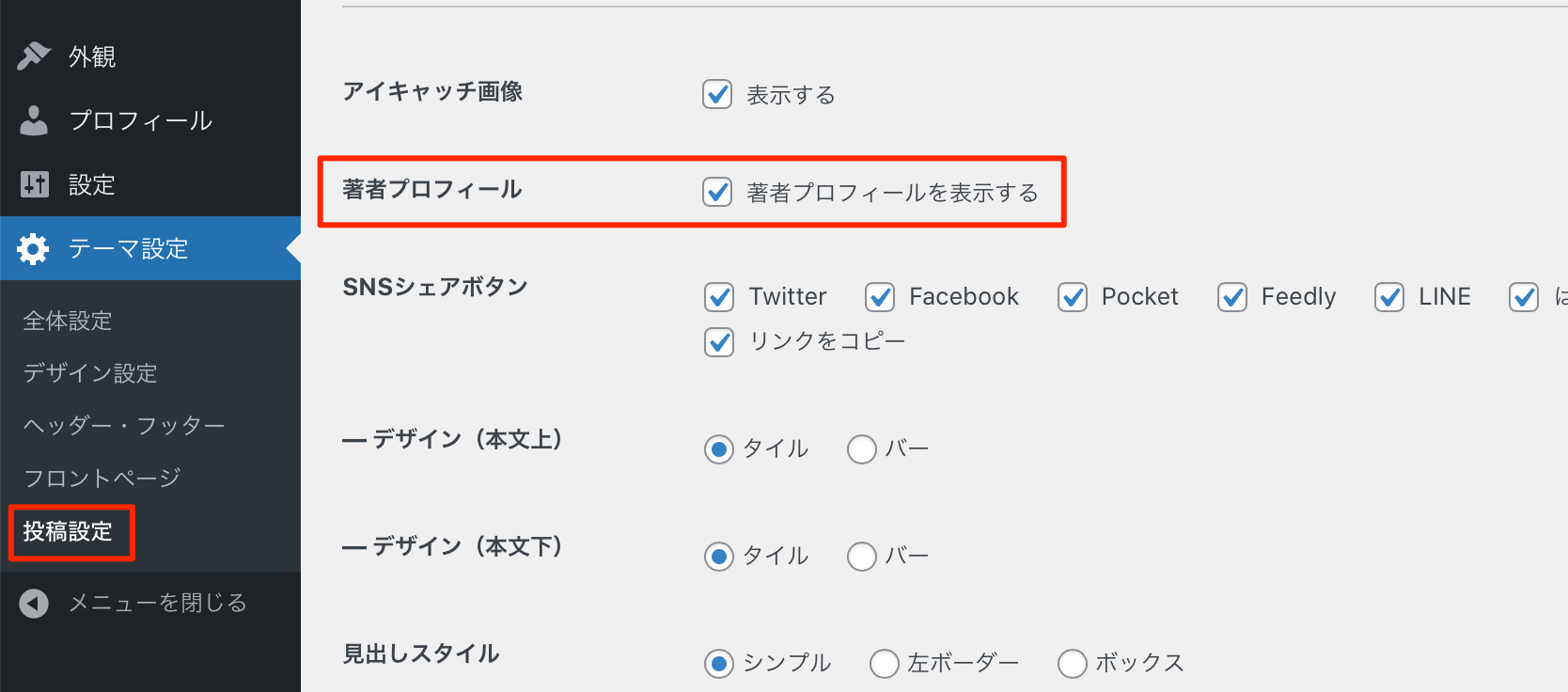 次にWordPress管理画面の「テーマ設定」>「投稿設定」で、「著者プロフィールを表示する」にチェックを入れ、保存します。