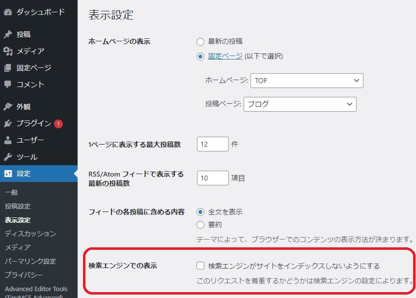 ここにチェックが入っている場合は、検索エンジンを寄せ付けないように設定しているという意味。