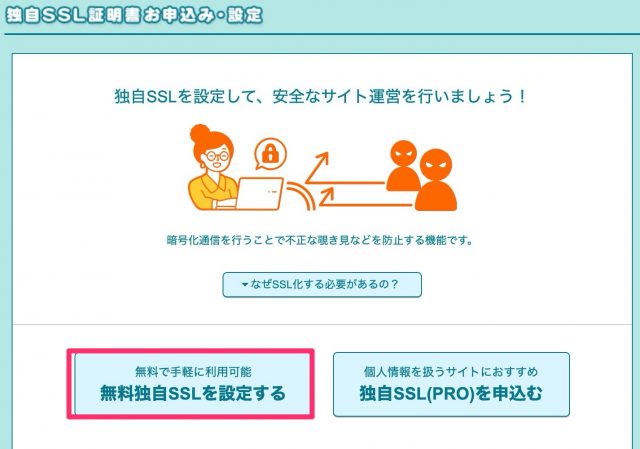 設定画面を表示させたら『無料独自SSLを設定する』ボタンをクリック。