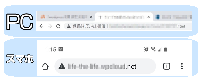 パソコン版では『保護されていない通信』と表示され、スマホ版では文字こそ出ませんがアドレスの横に警告マークが表示されてしまうのです。