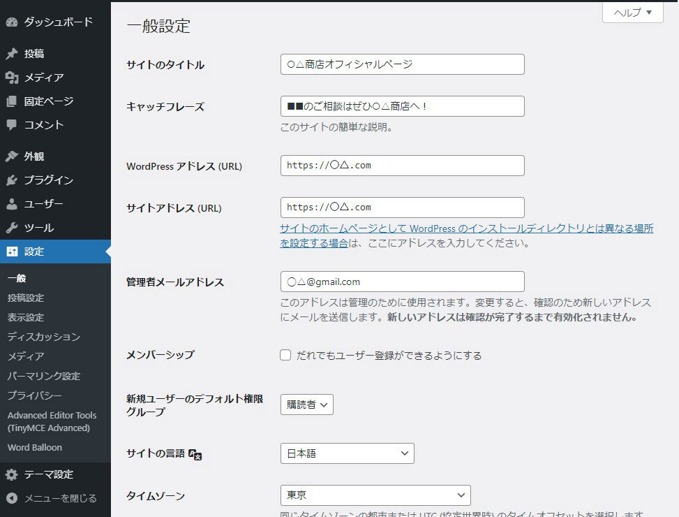 御社ホームページのWordPress管理画面を開き、設定>一般 へアクセスして下さい。サイトタイトルやアドレスなどを設定する画面です。
