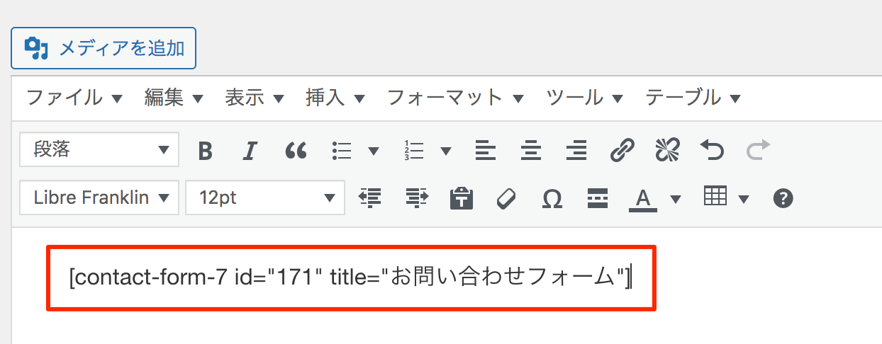 とショートコードを入力すると、「お問い合わせはこちら」という文章が表示されます。