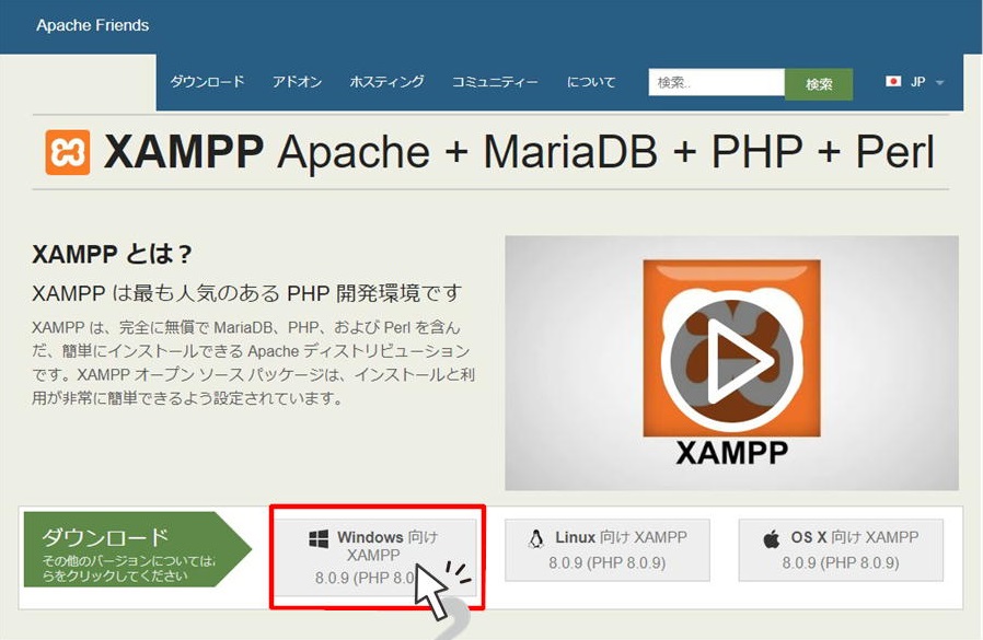 まずXAMPPの公式サイトからソフトウェアファイルをダウンロードして下さい。