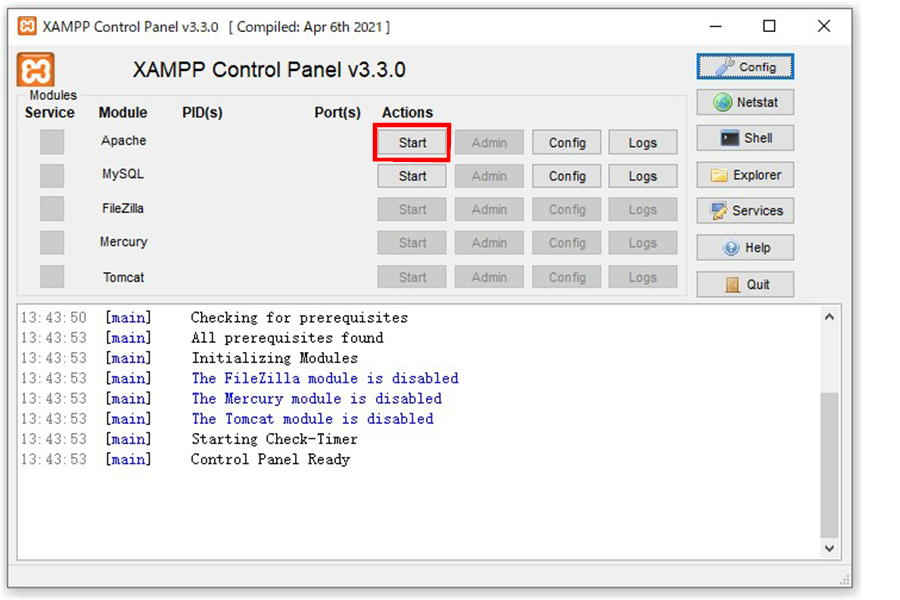 XAMPPの管理画面にあるApacheの「Start」をクリックします。