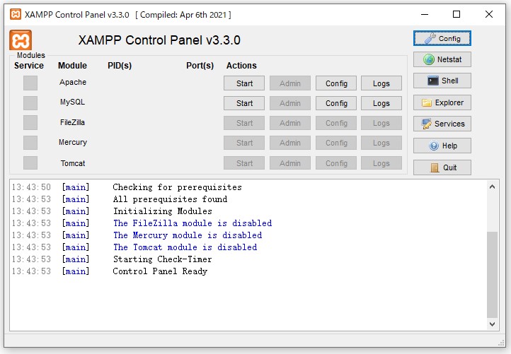『Finish』を押すとXAMPPの管理ツールが開きます。