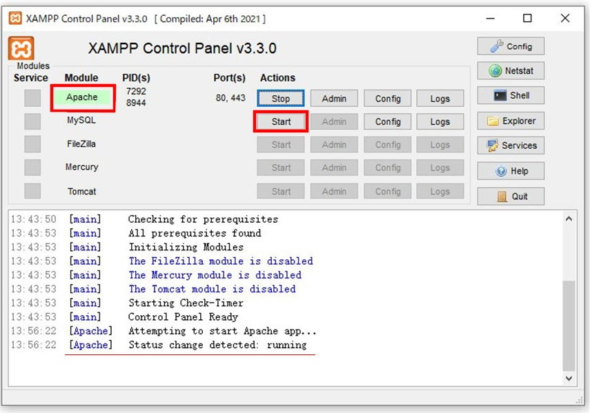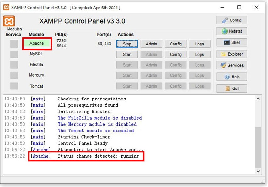 画面下半分に表示されているログにも、Apacheがrunning状態であることが表示されています。