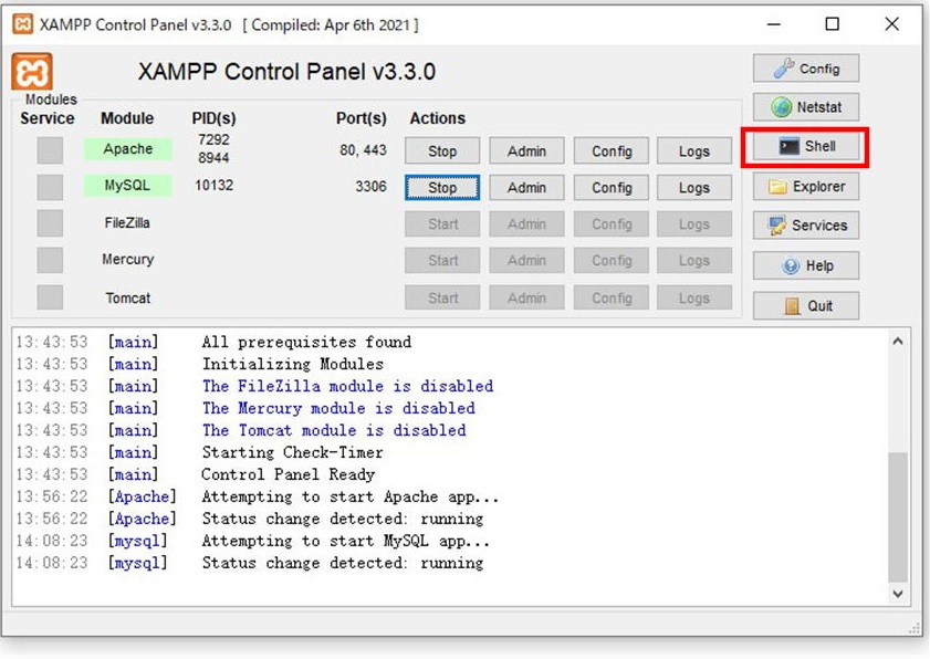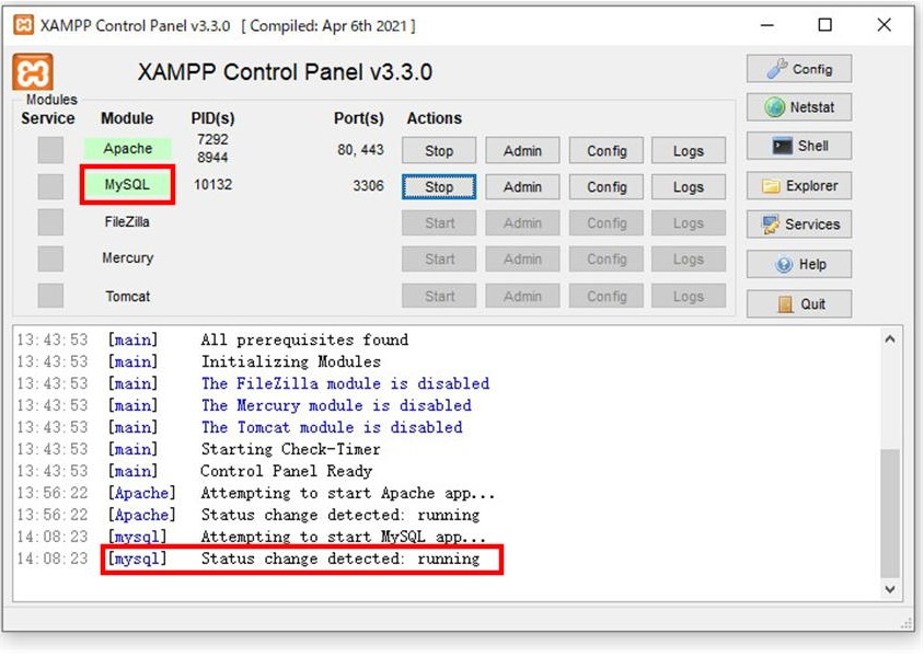 同じようにXAMPP の管理画面にある MySQL の「Start」をクリックします。